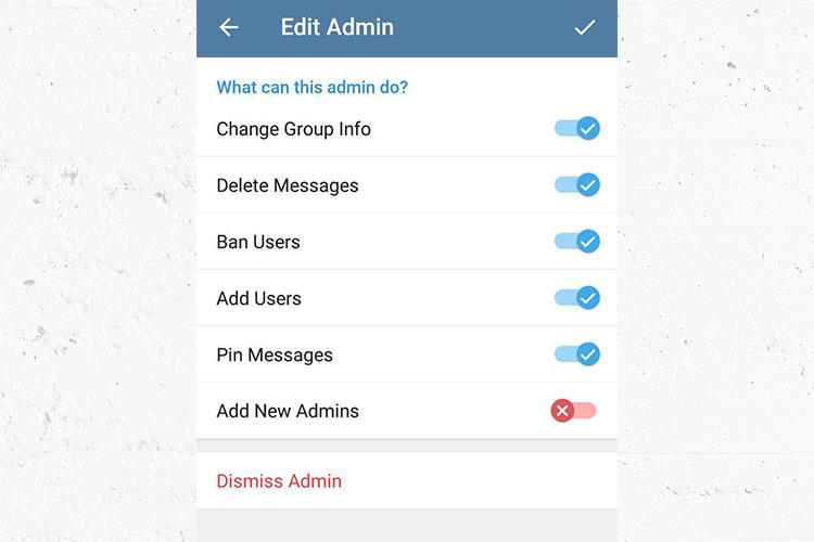 امکان تغییر اطلاعات گروه، حذف پیام دیگر اعضا، قابلیت Pin کردن پیامها، بلاک کردن اعضا و تنظیم یک ادمین جدید از مواردی هستند که ادمین اصلی گروه میتواند برای دیگر ادمینها مشخص کند. برای دسترسی به این بخش به صفحهی پروفایل سوپرگروه رفته و روی آیکون چرخدنده که به بالای صفحه اضافه شده است لمس کنید.
